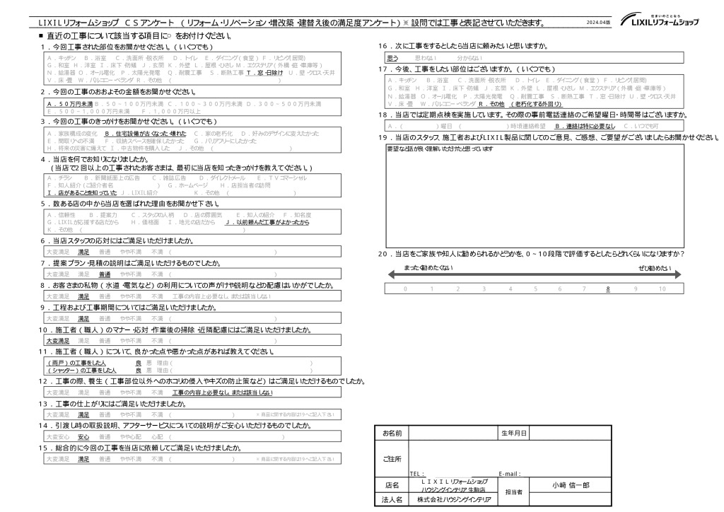 当店のスタッフ、施工者およびLIXIL製品に関してのご意見、ご感想、ご要望
