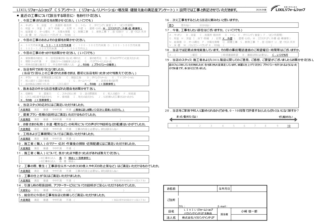• 当店のスタッフ、施工者およびLIXIL製品に関してのご意見、ご感想、ご要望
