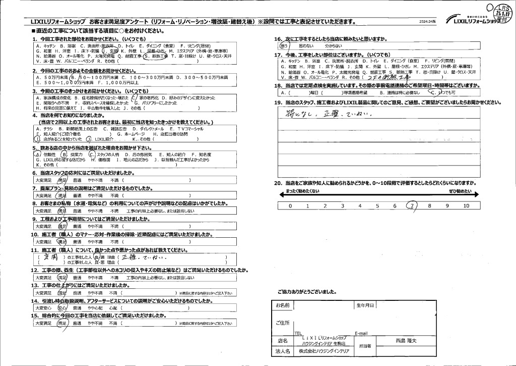 • 当店のスタッフ、施工者およびLIXIL製品に関してのご意見、ご感想、ご要望