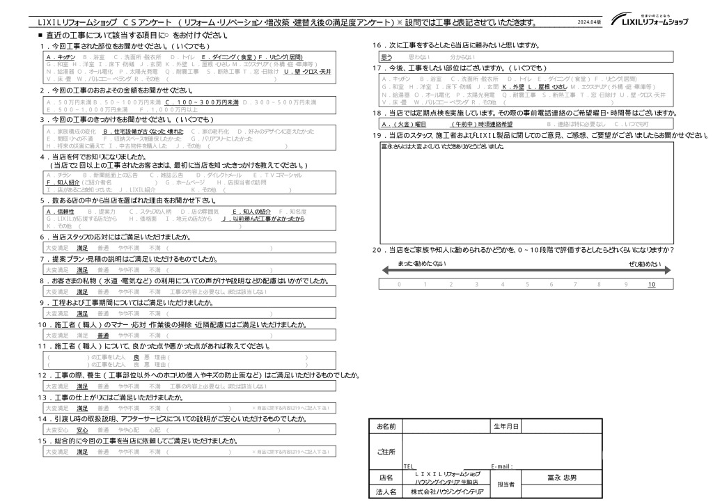 当店のスタッフ、施工者およびLIXIL製品に関してのご意見、ご感想、ご要望