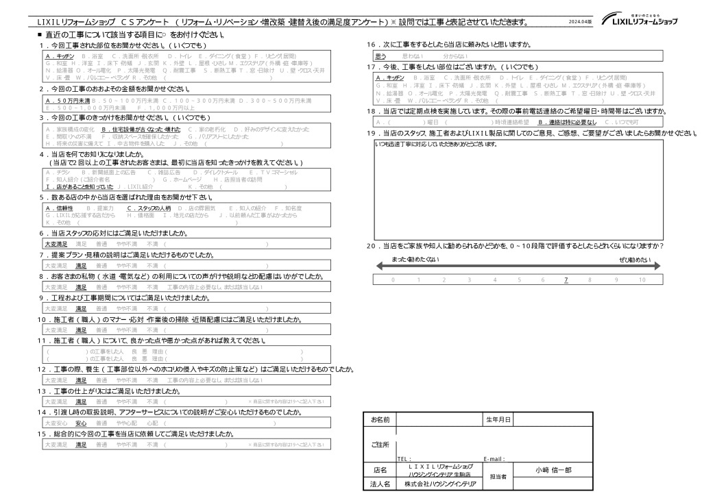 当店のスタッフ、施工者およびLIXIL製品に関してのご意見、ご感想、ご要望
