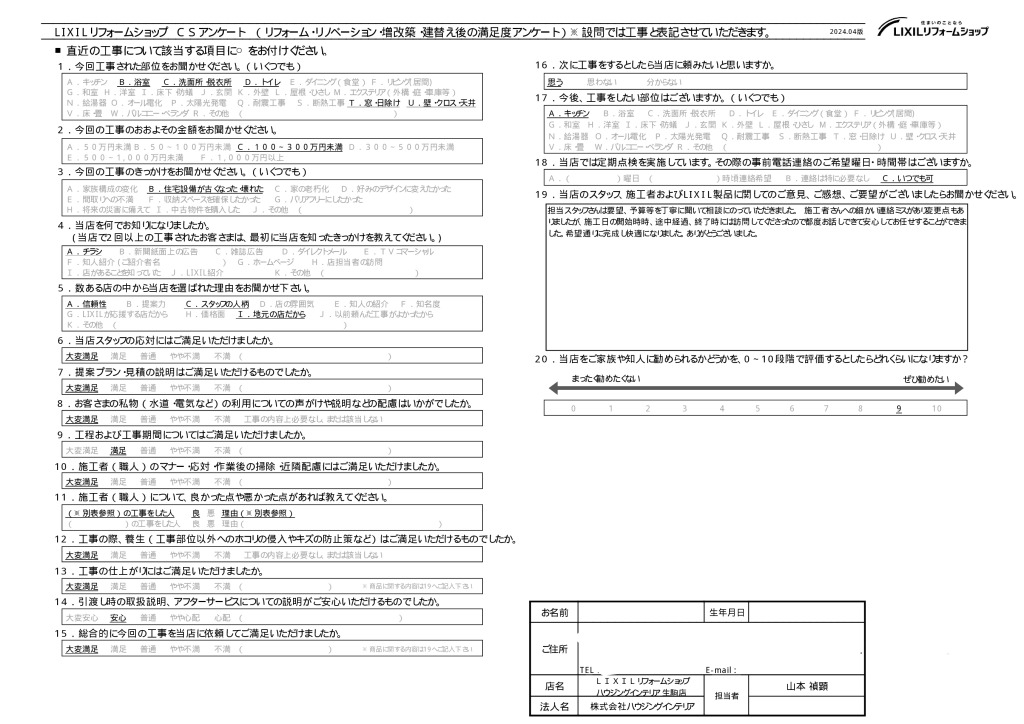 担当スタッフさんは要望、予算等を丁寧に聞いて相談にのっていただきました。 施工者さんへの細かい連絡ミスがあり変更点もあ りましたが、施工日の開始時時、途中経過、終了時には訪問してくださったので都度お話しできて安心してお任せすることができま した。希望通りに完成し快適になりました。ありがとうございました