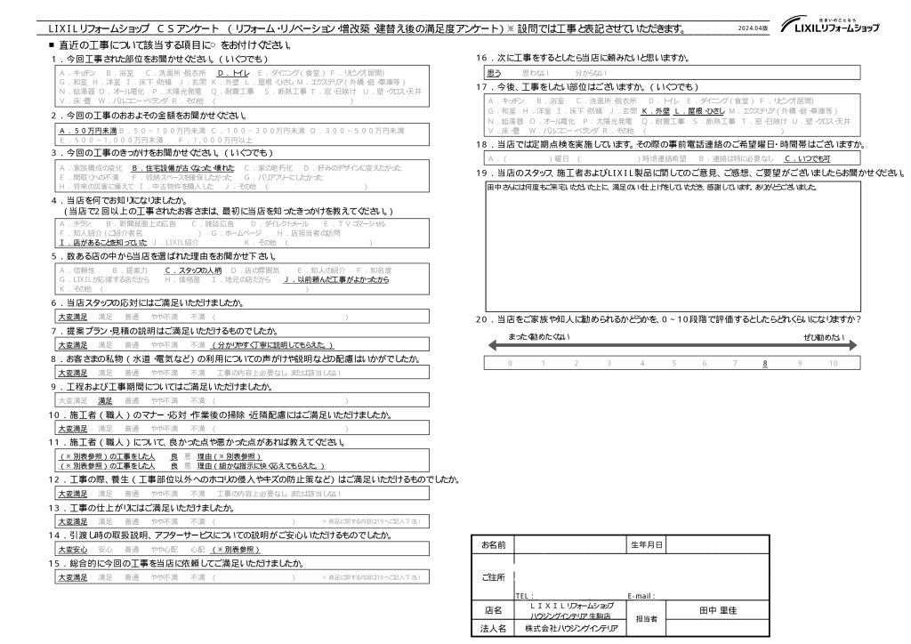 • 当店のスタッフ、施工者およびLIXIL製品に関してのご意見、ご感想、ご要望