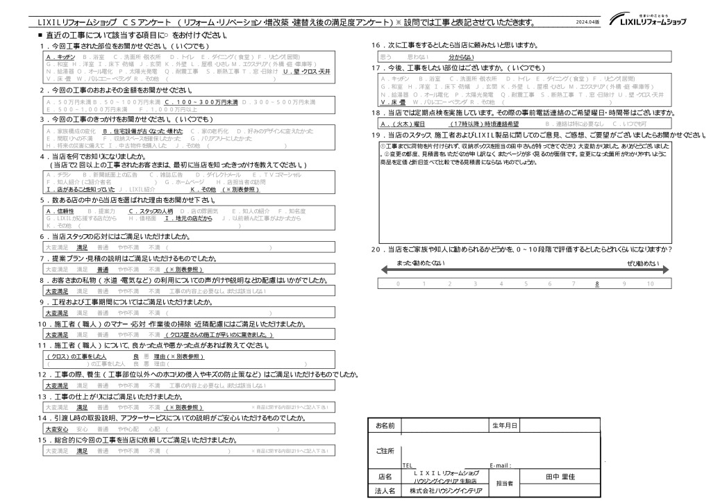 ①工事までに荷物を片付けられず、収納ボックスを担当の田中さんが持ってきてくださり、大変助かりました。ありがとうございました 。②変更の都度、見積書をいただくのが申し訳なく、またページが多く見るのが面倒です。変更になった箇所がわかりやすいように 商品を定価と新旧並べて比較できる見積書にならないものでしょうか