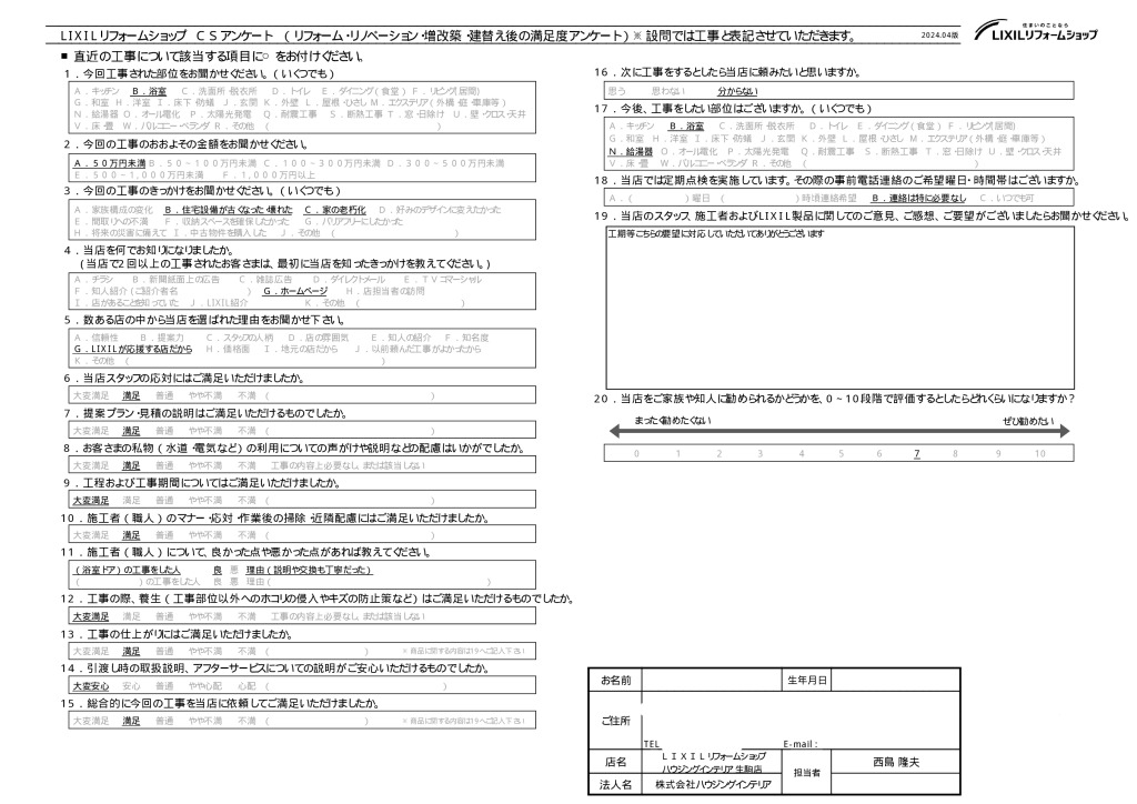 当店のスタッフ、施工者およびLIXIL製品に関してのご意見、ご感想、ご要望