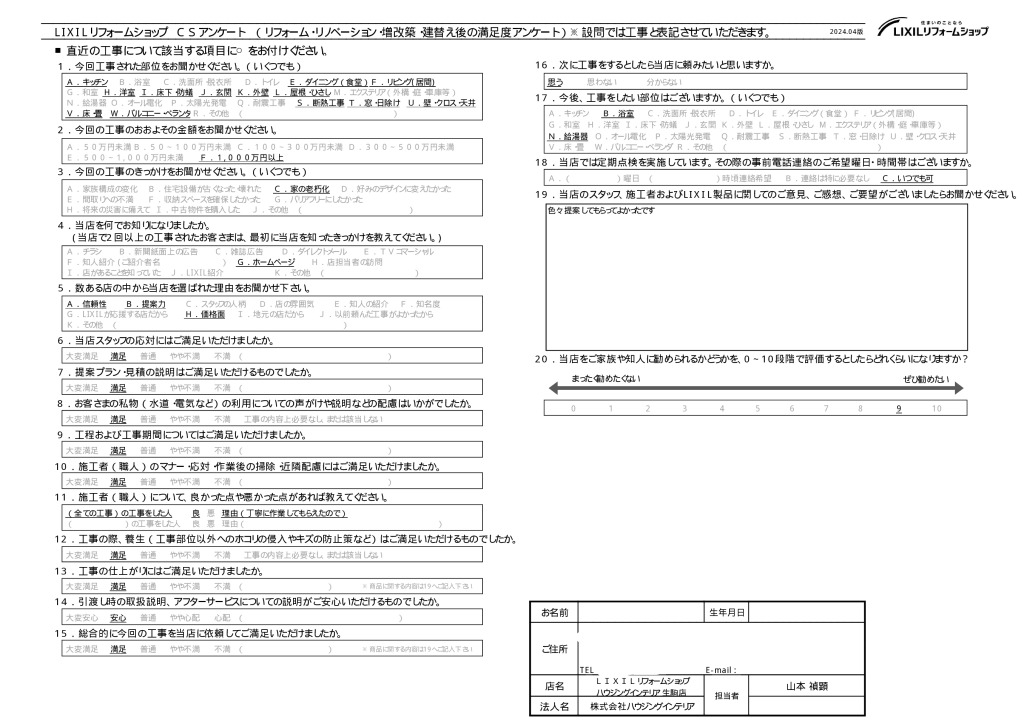 • 当店のスタッフ、施工者およびLIXIL製品に関してのご意見、ご感想、ご要望