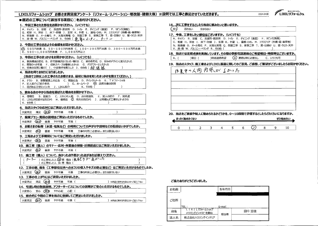 • 当店のスタッフ、施工者およびLIXIL製品に関してのご意見、ご感想、ご要望