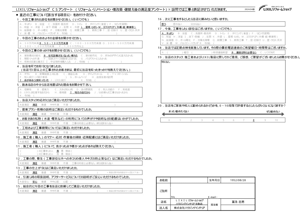 当店のスタッフ、施工者およびLIXIL製品に関してのご意見、ご感想、ご要望