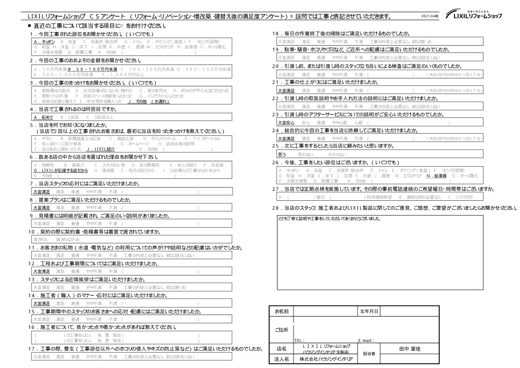 当店のスタッフ、施工者およびLIXIL製品に関してのご意見、ご感想、ご要望