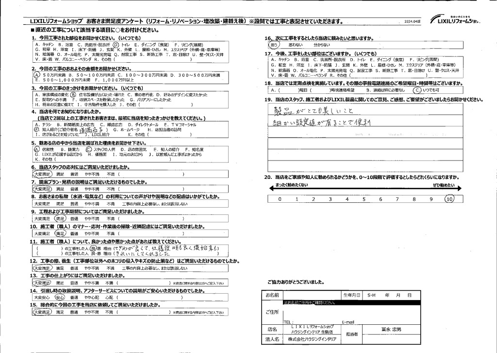 • 当店のスタッフ、施工者およびLIXIL製品に関してのご意見、ご感想、ご要望