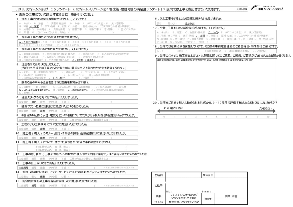 当店のスタッフ、施工者およびLIXIL製品に関してのご意見、ご感想、ご要望
